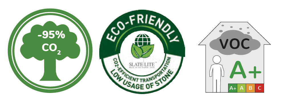Our slate sheets have a significantly lower CO₂ footprint compared to traditional wall tiles – up to 57.8 kg CO₂/m² less.